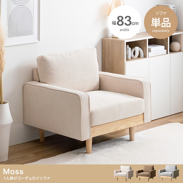 コーデュロイ×天然木がお部屋に上質感を醸し出す『Moss(モス)』1人掛けコーデュロイソファ 【組立品】 【梱包サイズ】84cm×74cm×38cm 【梱包重量】約22kg 【商品重量】約20kg 【耐荷重】約150kg 【注意】カバーは、色落ちの恐れ、生地が縮む場合がございますので洗濯はできません。 ※組み立て工具は不要です。 ※組み立て時間:2人以上で約10分 サイズ・容量 幅83cm×奥行76cm×高さ76cm(座面高:43cm) 規格 本体:ファブリック、ウレタンフォーム、Sバネ、ウェービングベルト、綿 張地:ポリエステル フレーム:天然木 天然木 注意事項 ▼誠に恐れ入りますが北海道・沖縄・離島エリアへの配送は行っておりません。 ご注文を頂きましても、お受けできかねますので予めご了承のほどお願い申し上げます。 ▼商品の仕様やデザインは、品質に問題がない程度に予告なく変更させていただく場合がございます 商品の仕様やデザインは随時改善をしており、入荷のタイミングによってはデザインが変更されている場合がございます。 何度も同じ商品をご注文しているお客様はくれぐれもご注意下さい。 部品、生産国、脚部の形状、縫製、カバー類の色や形、サイズなどに少々誤差が発生する場合がございます。 予めご了承を宜しくお願い致します。 商品管理番号:118030(登録/更新:2024/06/19)