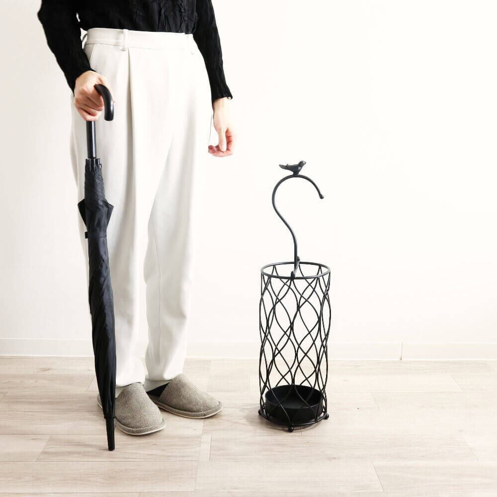 取っ手の鳥のオブジェがアクセントになったシンプルなアイアン製傘立てです。