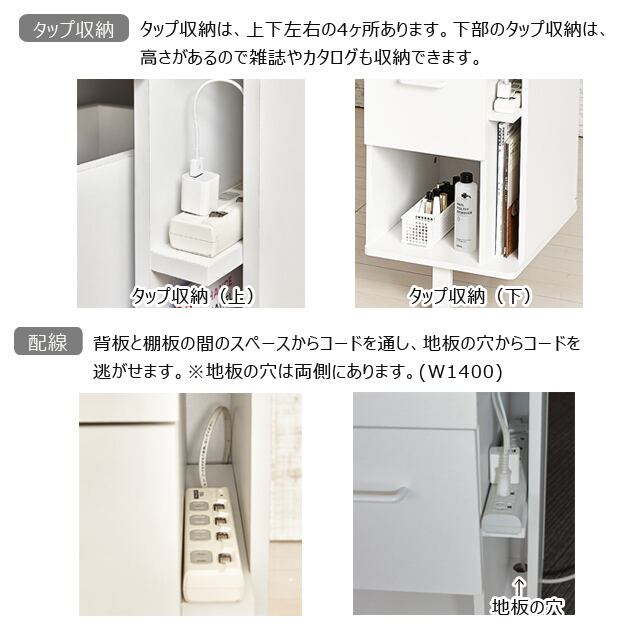 ◆タップ収納は上下左右の4ヶ所あります。下部のタップ収納は、高さがあるので雑誌やカタログも収納できます。
