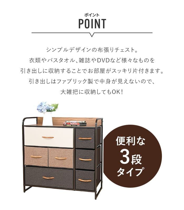 木目と布地がおしゃれでシンプルな布張りカラーチェスト、3段7杯ワイドタイプです。
