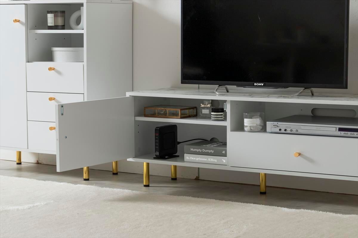 天板の大理石柄とゴールドのあしらいが特徴の『Camila(カミラ)』シリーズの引き出し付きテレビボード