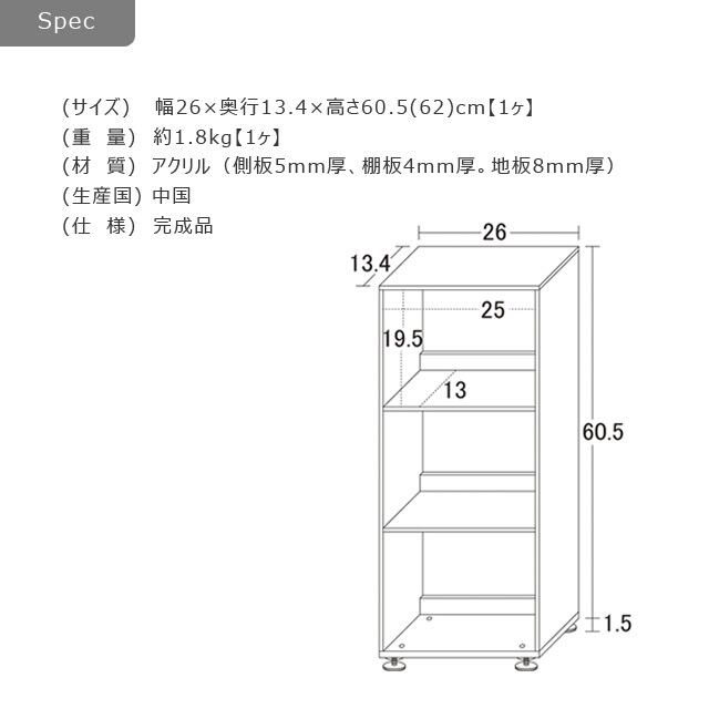 【材 質】アクリル(側板5mm厚、棚板4mm厚、地板8mm厚)