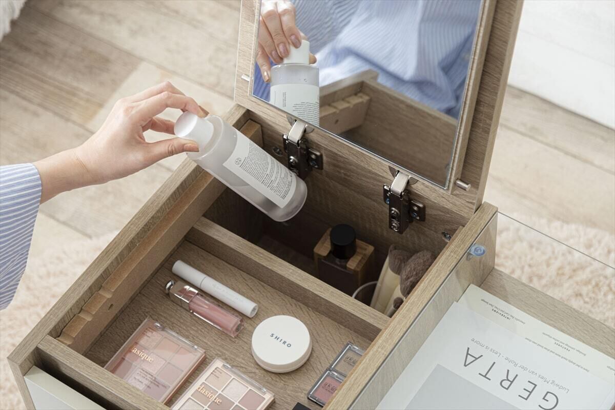木目とホワイトのバイカラーが印象的な『Erin(エリン)』シリーズのディスプレイ収納付きドレッサーテーブル